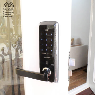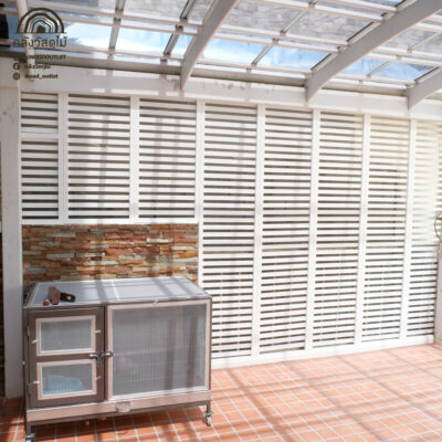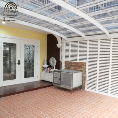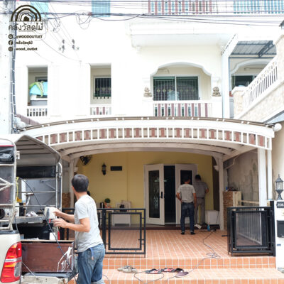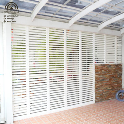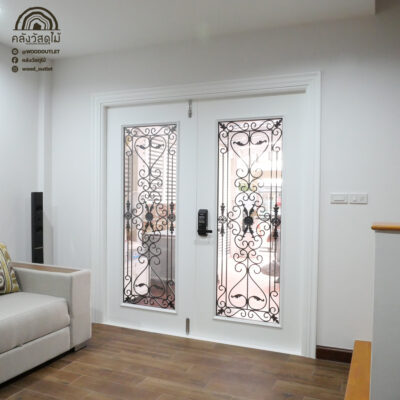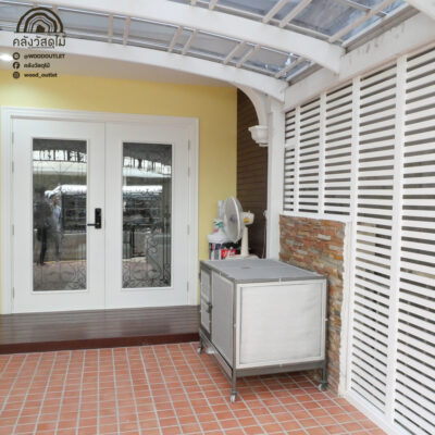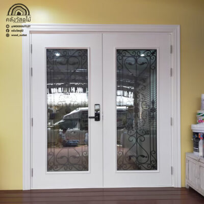 ประตูบานคู่กระจกนิรภัยนอกแบบ ทำสีขาวพร้มติดตั้งติจิติลล็อค และติดตั้งไม้ระแนงสั่งทำพิเศษสีขาว