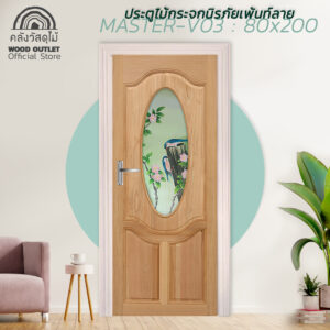 ประตูไม้กระจกนิรภัย กระจกเพ้นท์ลาย รุ่น MASTER-V03 ขนาด 80×200 cm.