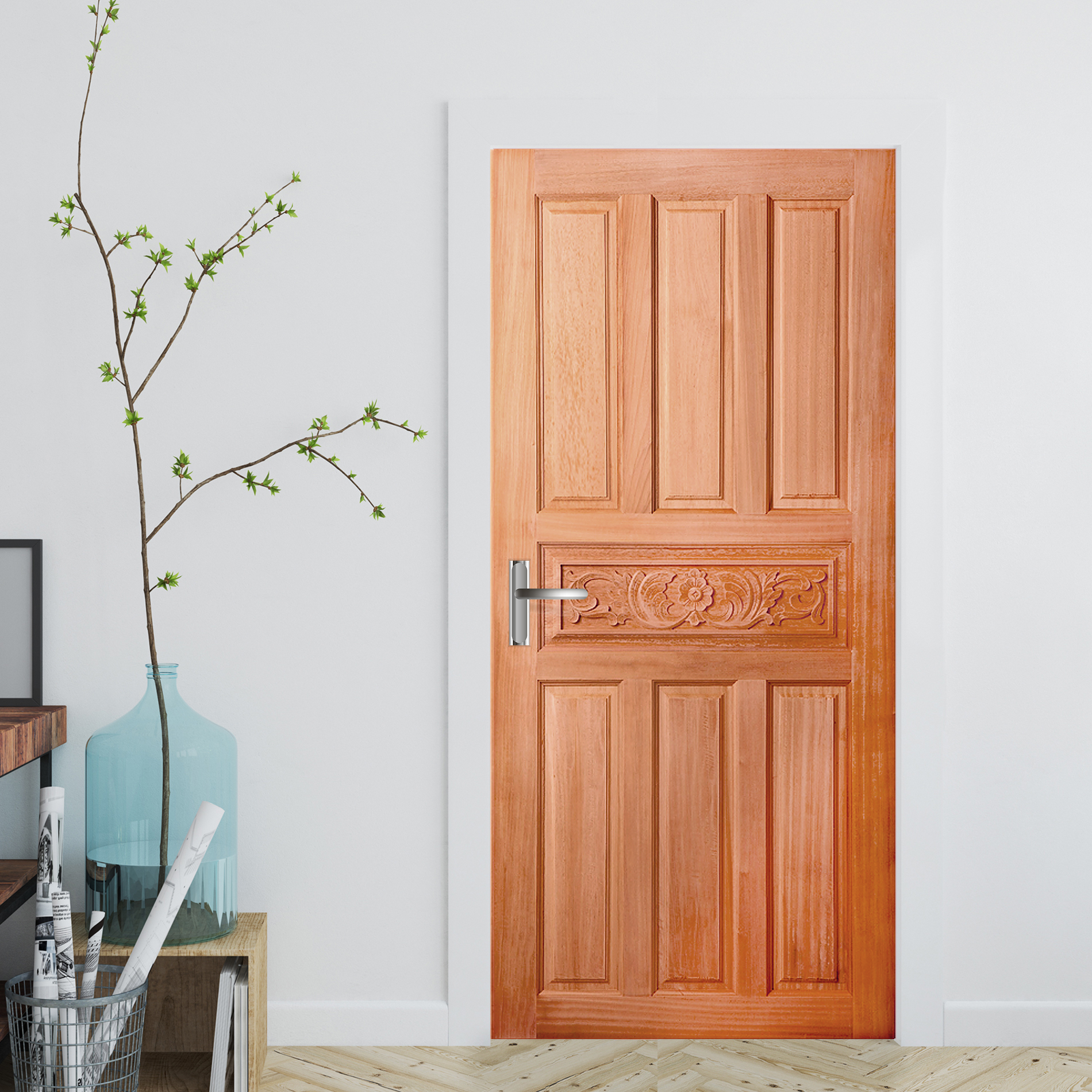 • ประตูไม้สยาแดงอบแห้งเน้นความเรียบง่ายในความชื้นสัมผัส 12-15% เพื่อลดปัญหาไม้หด บวม หรือ โก่งงอ มีเนื้อไม้โทนสีน้ำตาล
