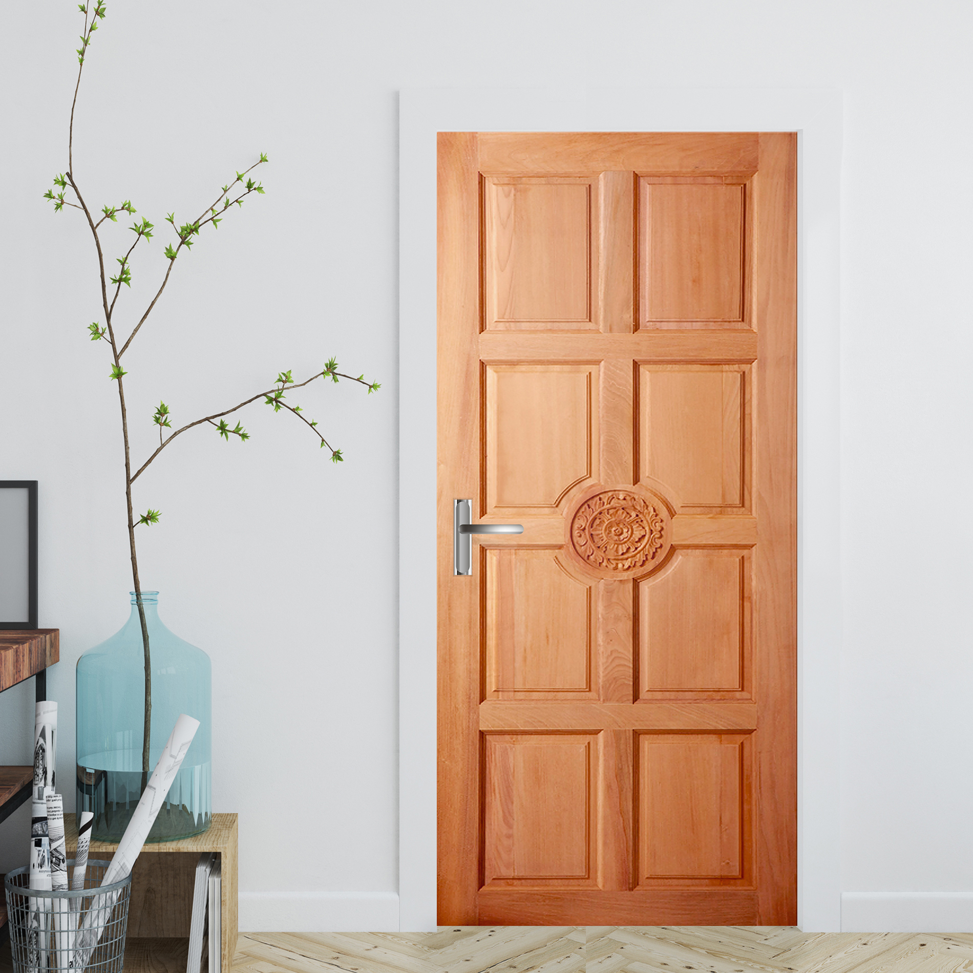 • ประตูไม้สยาแดงอบแห้งเน้นความเรียบง่ายในความชื้นสัมผัส 12-15% เพื่อลดปัญหาไม้หด บวม หรือ โก่งงอ มีเนื้อไม้โทนสีน้ำตาล