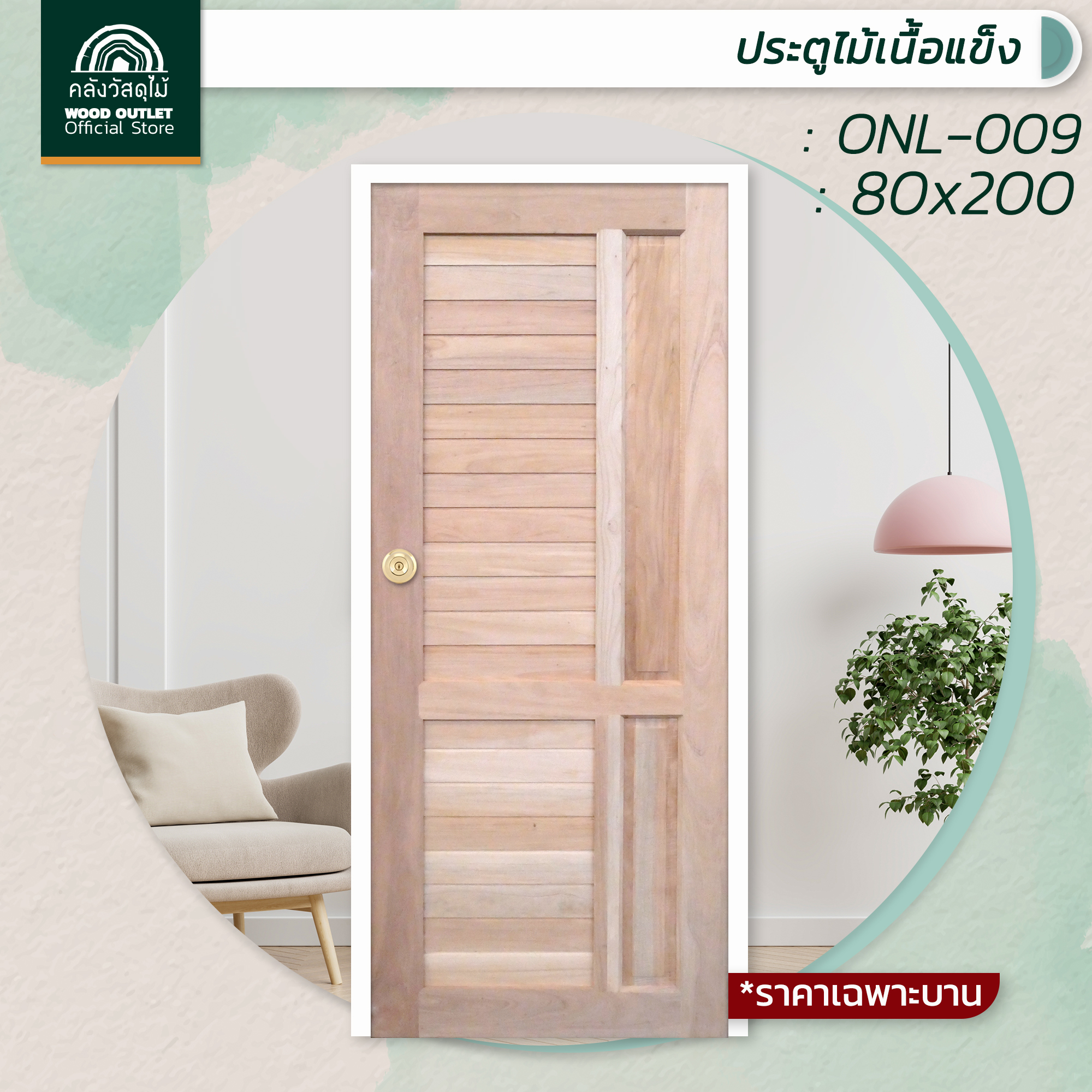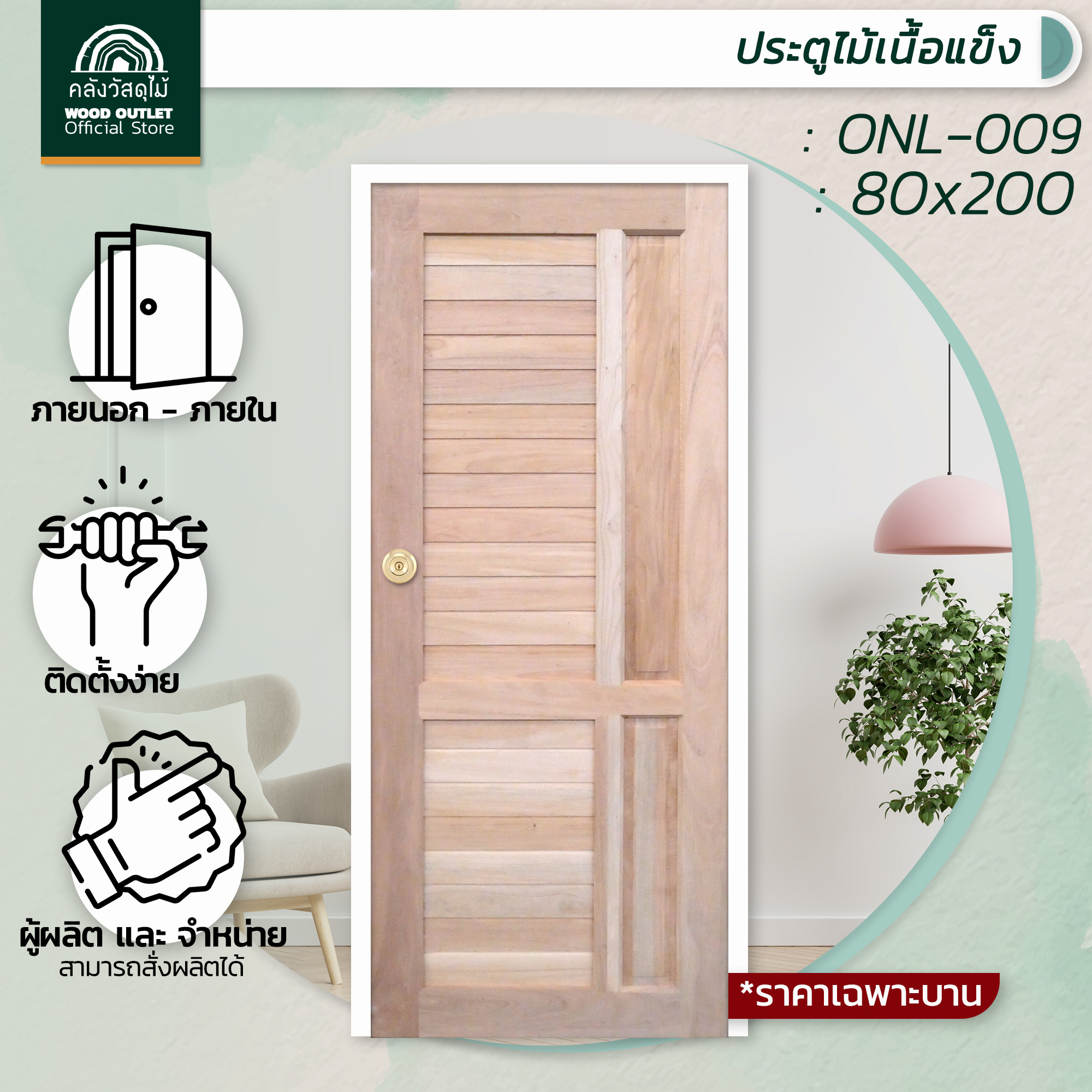 -ประตูไม้เนื้อแข็ง ขนาด 80×200 cm.