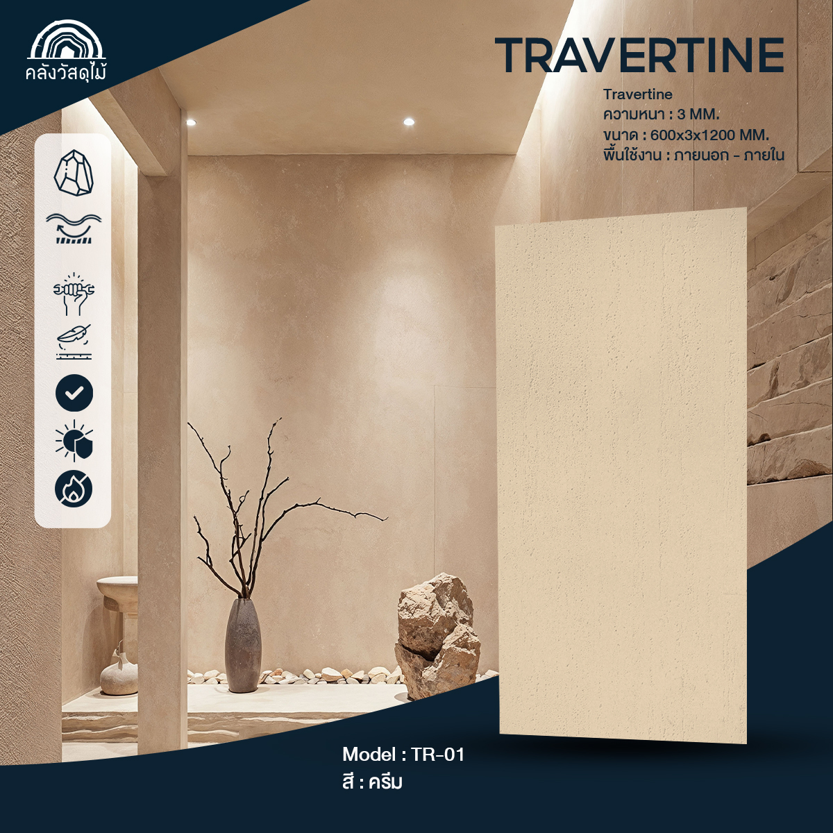 แผ่นหินเทียมติดผนัง SOFT STONE PANEL ภายนอก-ภายใน ลาย TRAVERTINE สีครีม รุ่นTR-01 ผิวสัมผัสธรรมชาติ พร้อมส่ง
